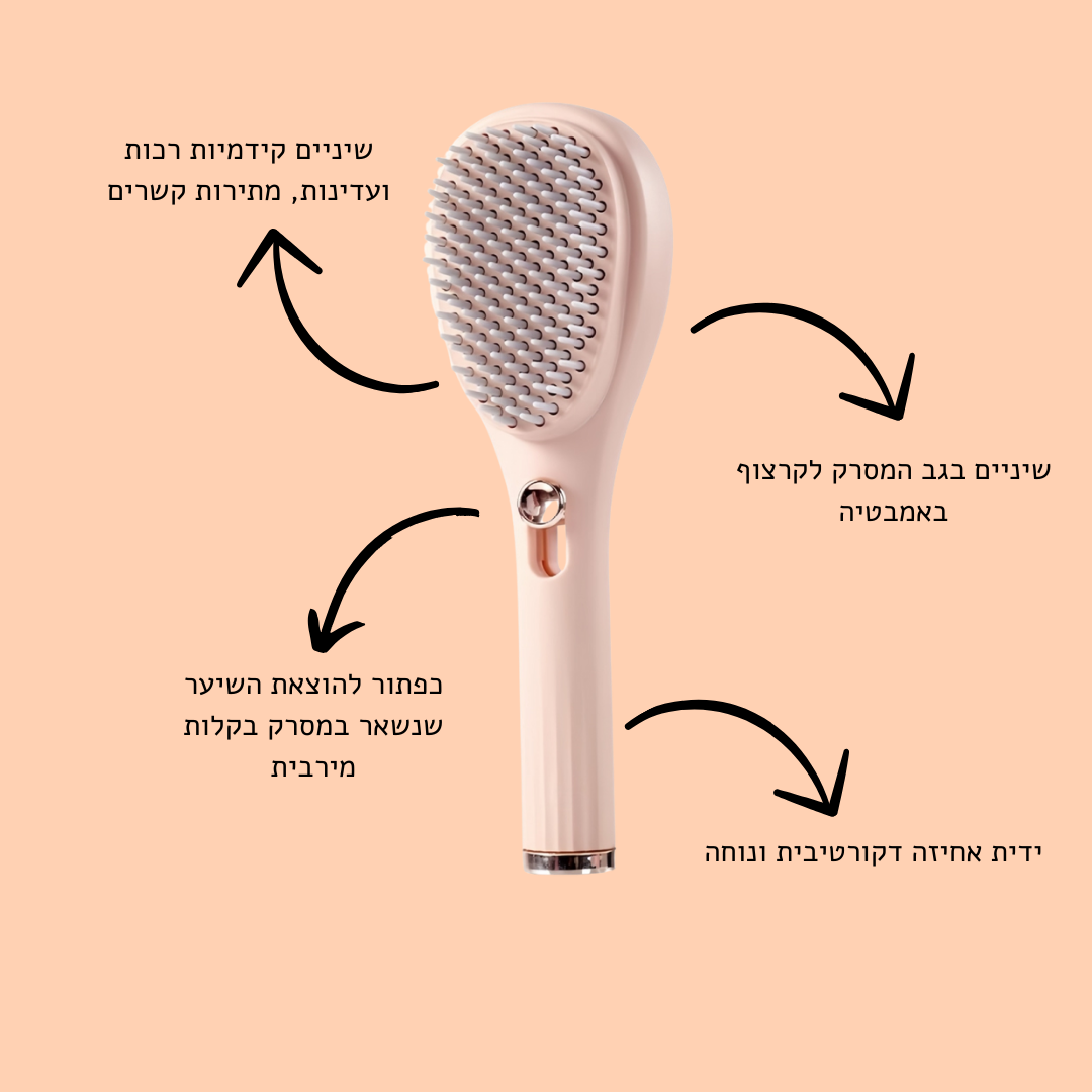 המסרק משלב מנגנון חכם שמאפשר להסיר את השיער שנתפס בין השיניים בלחיצה פשוטה. פטנט זה מונע את הצורך בניקוי ידני ארוך ומסורבל, מה שחוסך זמן ומשפר את חוויית השימוש, במיוחד עבור משתמשים עם שיער עבה או ארוך.